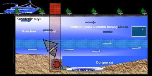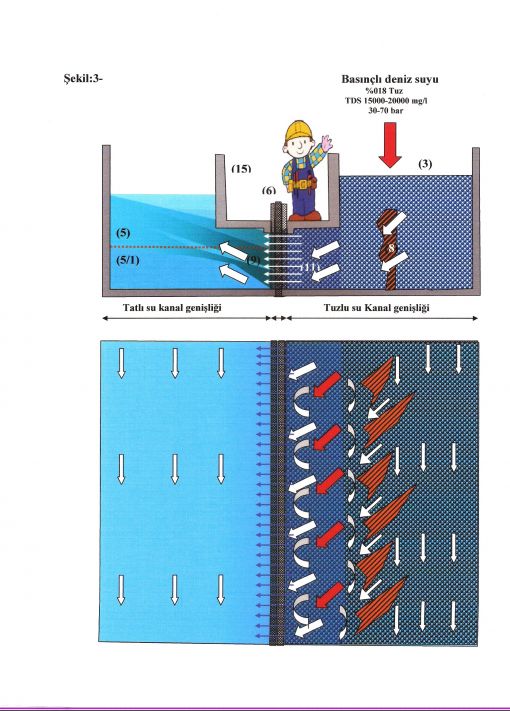 Şekillerde görüldüğü gibi, ters ozmos membranının her iki tarafına baktığımızda , bir tarafa tuzlu deniz suyu ve diğer tarafta tatlı su bulunduğu görülmekte , eğer tatlı suyun basıncı tuzlu deniz suyu basıncından fazla yada aynı ise tatlı suyun deniz tarafına geçmesini engellemek için deniz suyu tarafına basınç uygulamamız gerekmektedir. Olayımızda, denizler arasında boğaz ve kanallardan yer değiştiren suların yağışların bol olduğu ve akarsuların debisinin arttığı dönemlerde kanalın dar ve genişliği de dikkate alındığında suyun basıncı artmakta ve basınçlı deniz suyu membrantlara yönlendirildiğinde ters osmoz olayı meydana gelmekte ve membrandın tatlı su tarafında devamlı artan bir su bütçesi oluşmaktadır. . Buluş kapsamında, ters osmoz olayı , denizlerle denizleri birleştiren doğal ve yapay boğaz, kanal ve her türlü su yollarında içinde tuz ve her türlü iyon, inorganik ve organik maddeler, kolloitler, bakteriler ve her türlü istenmeyen moleküller bulunan yüzey ve/veya alt akıntılı basınçlı deniz suyunun aynı yöne akan ve akarsu ve göllerden ve yağışlardan toplanan daha az basınçlı tatlı su kaynaklarının membranlarla ayrılarak aynı membrana teması ile deniz suyunun tuz ve diğer çözeltilerden arınarak tatlı su tarafına geçmesi ile deniz suyunun içme ve kullanma suyu haline getirilerek kanal bölgesindeki tatlı su kaynaklarının çoğaltılması ve şehir şebekesine dahil edilerek kanal çevresi ve kanalın bulunduğu il ve ilçelerin içme ve sanayinin kullanma suyu ihtiyaçlarının büyük oranda çözüme kavuşturulması amaçlanmıştır.