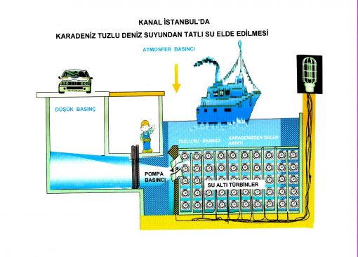 Açılacak Kanal İstanbul’da monte edilecek üst ve alt akıntıları toplayan 10 metre enindeki su toplama düzeneklerinin yüzeyden gemi geçişlerini engellemeyecek derinliğe inşa edildiği,İnşa edilen su toplama düzeneklerine monte edilen ideal genişlikteki borularla toplanan ağırlığı yoğun tuzlu deniz suyunun 25 metreden Türbinler üzerine düşürüldüğü,Türbinlere düşümü sağlanan güçlü tuzlu suyla mekanik kuvvetin harekete geçirildiği,Türbinlerden tahliye edilen suların Marmara’dan Karadenize doğru olan dip akıntı yönüne salındığı verileri dikkate alındığında ;