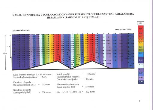 Karadeniz suyunun boğazlardan üst akıntı olarak geldiği ve 40 cm yüksekten Marmara Denizine doğru aktığı ve suyun yüzeyden 16 metre derinliğe kadar indiği, İstanbul Boğazı ve Kanal İstanbul’un toplam uzunluğu 75 Km olduğu, İstanbul Boğazı ve İstanbul kanalından günde 960.000 m3 suyun Karadeniz’den Marmara’ya aktığı hesaplandığı;