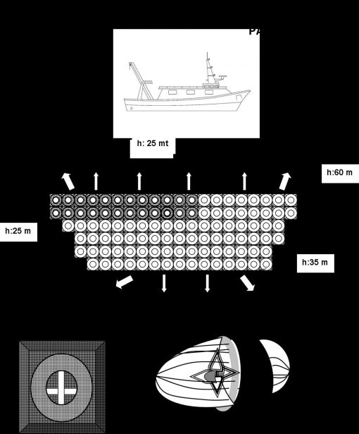 Şekil;1 ve 1/1’de görülen çizimlerde , Sualtı Hidroelektrik santral projesinde , santralın tabana oturacağı derinlik deniz yüzeyinden 60 metre olarak düşünülmüştür. 60 metre tabana inşası yapılacak 10 metre yüksekliğindeki türbin binasına dikey yada yatay konumda salyangoz türbinler veya tekniğin son geliştirdiği türbinler monte edilecektir.